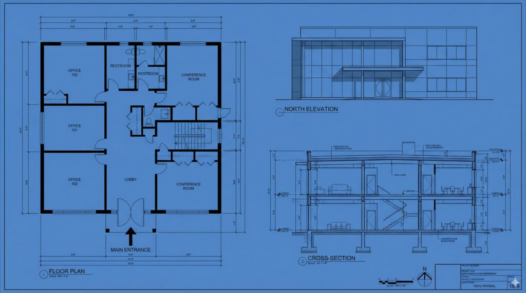 技术图纸:绘制一份正投影蓝图,以平面图、立面图和剖面图的形式描述该建筑物。使用专业建筑字体清晰标注“北立面”和“正门”。格式为 16:9。