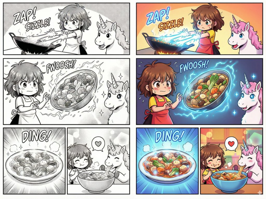 无需网格即可生成连续的艺术图或故事板,从而确保在一次操作中实现连贯的叙事流程。