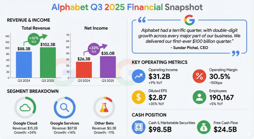 财报信息图(数据导入):[输入谷歌最新财报的 PDF 文件] “生成一个简洁现代的信息图,概括这份财报的关键财务亮点。包含‘营收增长’和‘净利润’图表,并在风格化的引言框中突出显示 CEO 的关键语录。”