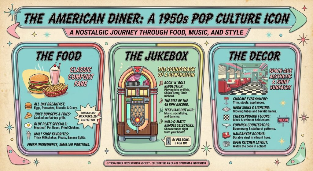 复古信息图:制作一张 20 世纪 50 年代风格的复古信息图,介绍美国餐馆的历史。信息图应包含“食物”、“点唱机”和“装饰”等独立部分。确保所有文字清晰易读,并符合当时的风格。