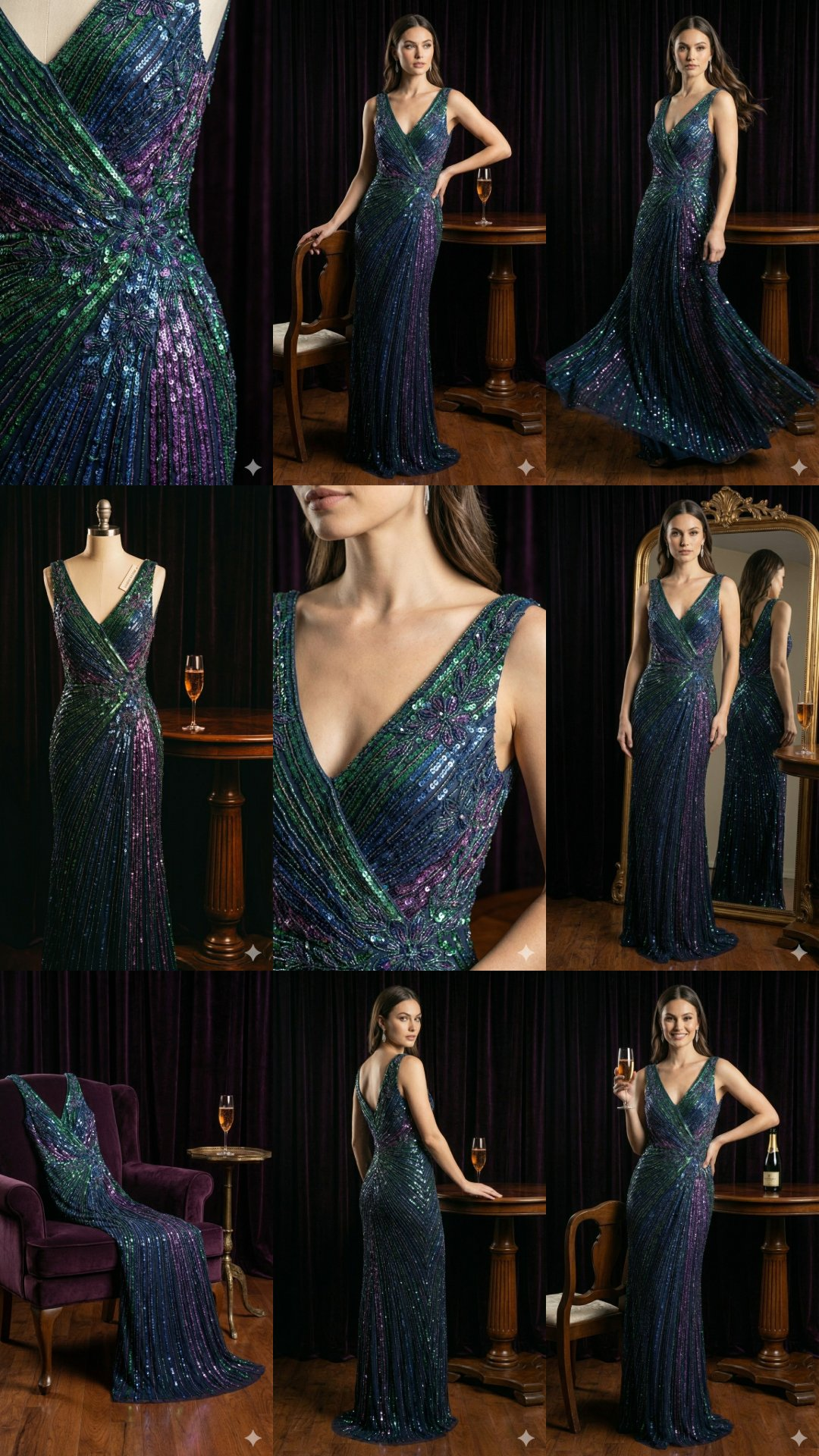 “创作 9 张精美时尚大片,风格如同获奖时尚大片。以此为品牌风格参考,但需在产品系列中加入细微差别和多样性,以展现专业设计感。请依次创作 9 张图片。”