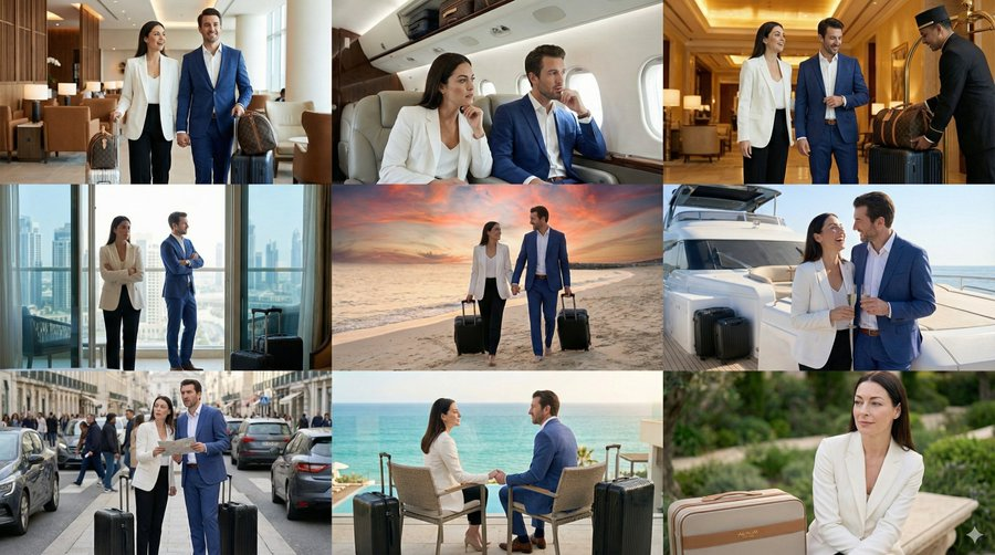 请创作一个引人入胜的九部分故事,包含九张图片,故事中需出现一位女性和一位男性,他们正在拍摄一部屡获殊荣的豪华行李箱广告。故事应有跌宕起伏的情感,最后以一位女性手持品牌标识的优雅照片结尾。男女主角的身份和着装必须保持一致,但可以从不同的角度和距离拍摄。请逐一生成图片。请确保每张图片均为 16:9 横向格式。